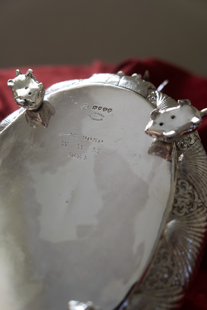The maker, James Fox, was a member of a distinguished family of silversmiths who sold work directly to clients and worked for retailers. The dishes are also marked under the base with the retailers’ name of Lambert of Coventry Street, and it is likely that the dishes were commissioned from them, the manufacturing order being placed with James Fox, who was a regular supplier. The mark of other members of the Fox family and the retailer Lambert are found on a number of pieces in The Inner Temple collection suggesting that the two companies were employed as suppliers; for example the large Victorian rosewater dish of 1878, located in the Hall showcase and a reproduction of the 1563 silver gilt melon cup, copied in 1898, the original of which is also in the Hall display.