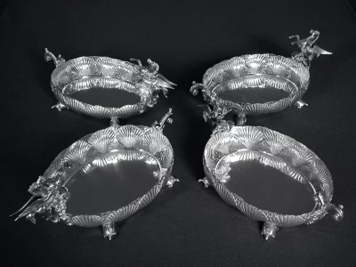 Richard Parsons: From time to time, a piece or group of silver objects appear on the market, or is viewed in a private collection, whose use or function is not immediately obvious. The set of four charming silver dishes in the Inn’s collection, made by James Fox in 1885/6, are an example. Oval in appearance the dishes are each raised on four small turtle feet, with shell form-edges, a scroll handle at one end and a Pegasus at the other. The Pegasus indicates that the dishes were made as a commission for The Inner Temple and their appearance gives an indication that they were made for some shellfish related food.
