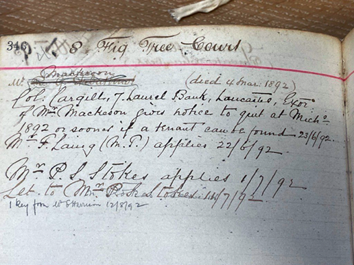 Mackeson was admitted to The Inner Temple in 1832, aged 19. He had gone up to Oxford aged 16 in March 1829. He graduated from Queen’s College in 1833 with a 3rd in Classical Honours and a 1st in Mathematical Honours and was Called to the Bar in 1836. From 1850–1885, he was a Chancery Practitioner at 1 New Square for most of his practising life but for a few years before his death he is listed as a being a tenant at 8, Fig Tree Court, paying £80 annual rent. His executor, Colonel Cargill, is given Notice to Quit by Michaelmas “or sooner if a tenant can be found”.