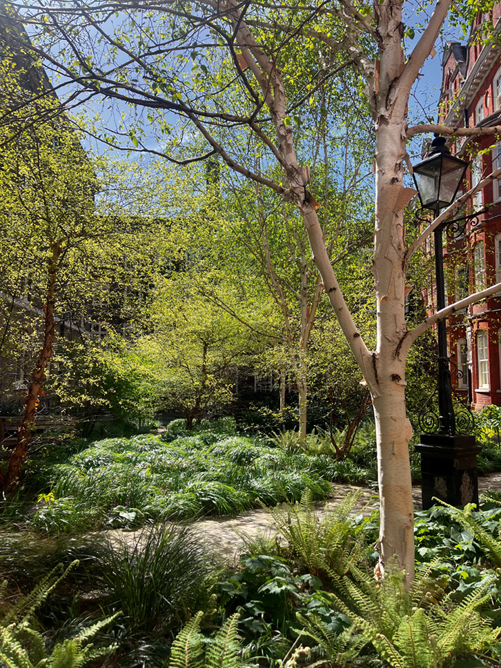 Since you took over, as well as extending the beds around the west side of the lawn to add more interest and creating a garden room around the pond (both a great success), the emphasis has been on developing a romantic look that works with nature and enhances the biodiversity of the garden. This has included extending the meadow and the tree circle planting, creating dead wood areas for insects, allowing more self-seeding and letting seed heads stand into the autumn, and replacing the liriope under the plane trees with a much more diverse ecosystem of plants. Your success in creating a much-needed oasis for wildlife in the city has been recognised with numerous awards.