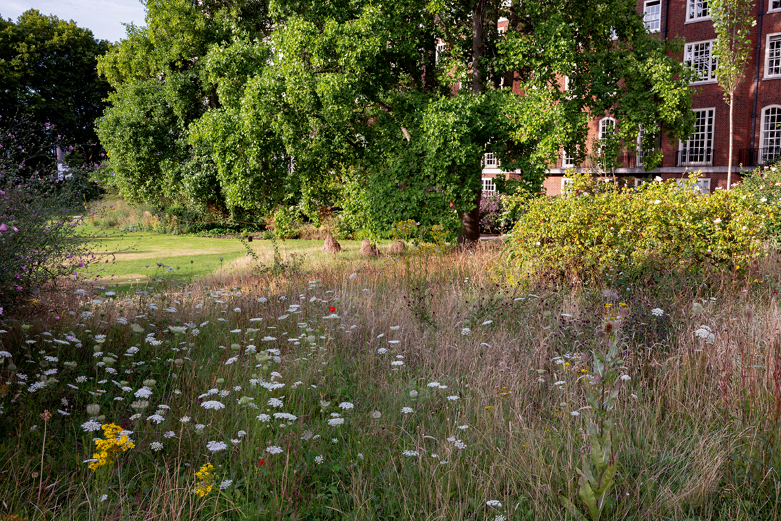 Since you took over, as well as extending the beds around the west side of the lawn to add more interest and creating a garden room around the pond (both a great success), the emphasis has been on developing a romantic look that works with nature and enhances the biodiversity of the garden. This has included extending the meadow and the tree circle planting, creating dead wood areas for insects, allowing more self-seeding and letting seed heads stand into the autumn, and replacing the liriope under the plane trees with a much more diverse ecosystem of plants. Your success in creating a much-needed oasis for wildlife in the city has been recognised with numerous awards.
