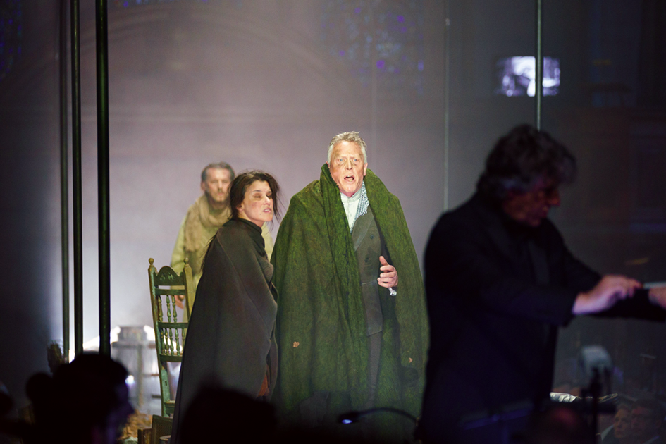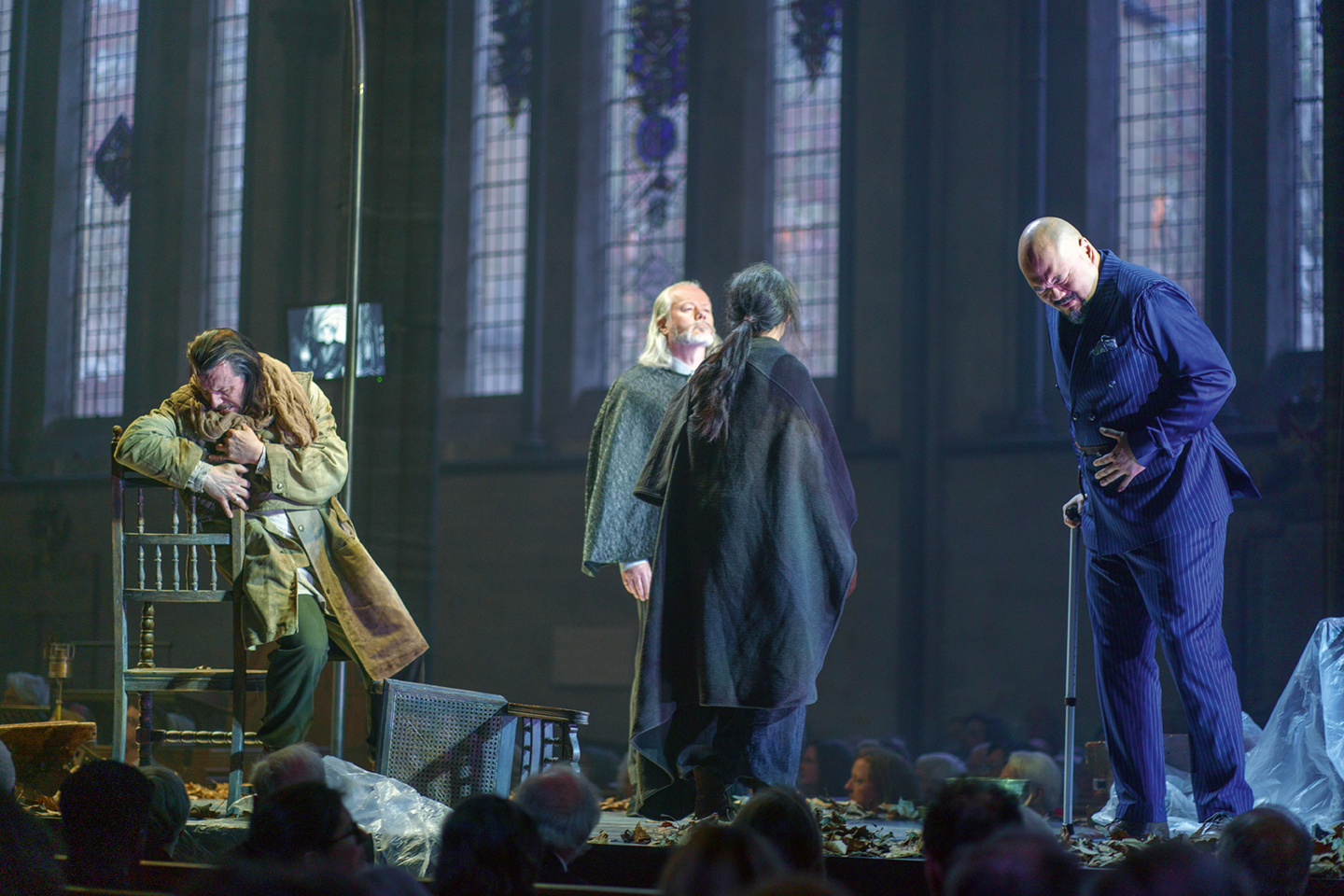The stage setting was a long walkway with dried leaves which spanned the length of the aisle. Director Julia Burbach used the space imaginatively with the flowing path of people journeying, seeking, during the Act 1 prelude, and with Kundry (Natasha Jouhl) guiding us. Although she only sings one word (“Dienen” – “let me serve”) twice in Act 3, she gave a deeply moving performance that emphasised the centrality of her character.