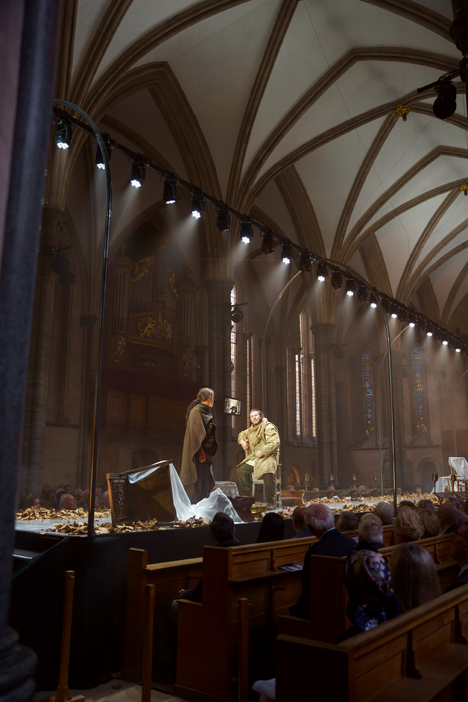 The stage setting was a long walkway with dried leaves which spanned the length of the aisle. Director Julia Burbach used the space imaginatively with the flowing path of people journeying, seeking, during the Act 1 prelude, and with Kundry (Natasha Jouhl) guiding us. Although she only sings one word (“Dienen” – “let me serve”) twice in Act 3, she gave a deeply moving performance that emphasised the centrality of her character.