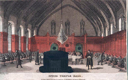This mezzotint shows the Inn’s medieval Hall before it was replaced in the late 1860s. It is thought to be built on the site of the old Knights Templar Hall, perhaps incorporating much of the old building within it.